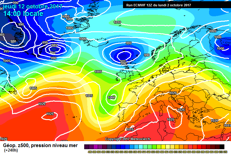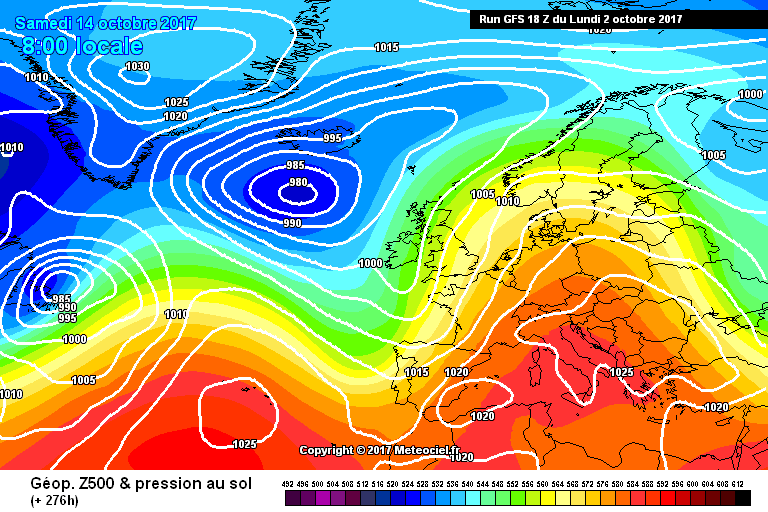 El inicio del puente estaría dominado por un robusto anticiclón sobre el sur de Europa, que canalizaría vientos de latitudes más bajas sobre nuestro país. Observa la isobara que sube por Portugal desde Algarve hasta Lugo. Recordemos que en nuestro hemisferio los vientos giran en sentido horario sobre los anticiclones. Pero por el Atlántico vemos una pequeña depresión que comienza a integrarse en la circulación de Oestes.