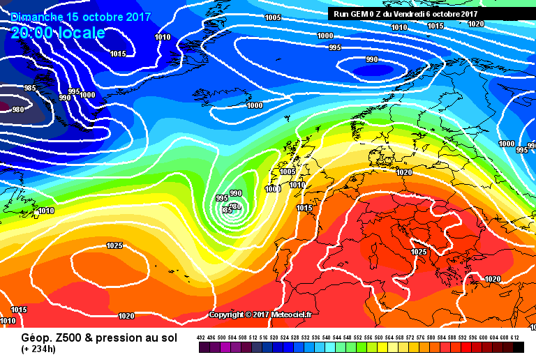Como vemos, las altas presiones pierden protagonismo dejando que el aire frío y la inestabilidad ganen terreno por el norte. Vamos a ver un modelo más, en este caso el GEM que también resta protagonismo a las altas presiones, incluso con una depresión mucho más marcada al noroeste del país.